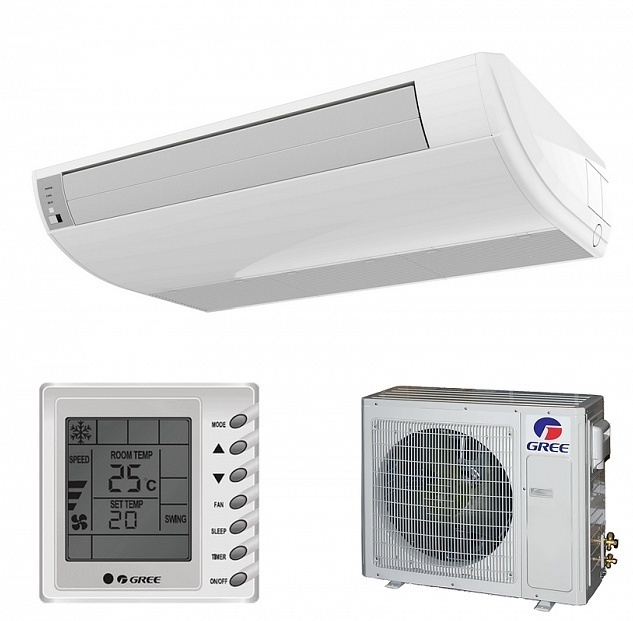 Напольно - подпотолочный кондиционер: если в помещении нет подвесного потолка, то альтернативой кассетному кондиционеру может стать напольно-подпотолочный (или просто потолочный) кондиционер. Устанавливаются они либо внизу стены, либо на потолке. При этом поток воздуха в первом случае направляется вверх, во втором — горизонтально вдоль потолка. Такая конструкция позволяет равномернее распределять охлажденный воздух по помещению и избегать попадания прямого потока на людей. Существуют модели потолочных кондиционеров распределяющие охлажденный воздух сразу по четырем направлениям, причем сила потока регулируется отдельно по каждому из направлений. Такой кондицонер может успешно применяться для охлаждения помещений сложной формы, не имеющих подвесного потолка.